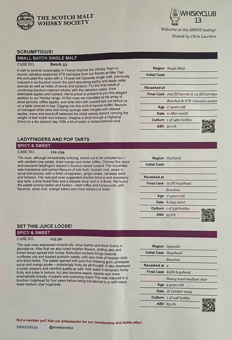 Chris bracht ons een schitterende SMWS line up, met ronkende whisky namen zoals Scrumptious, Chewy-Textured Meanderings enz... een avond niet te vergeten dank u Chris en eveneens onze whiskyliefhebbers voor de voltallige opkomst.